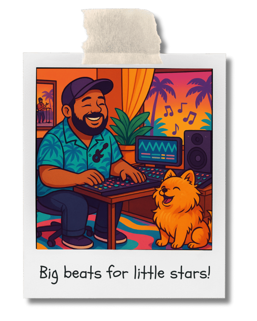 Then turn up the volume for Daddy George’s songs — cool island jams that’ll have you dancing, grooving, and smiling from ear to ear! So fluff up your fur, grab your mic (or hairbrush), and get ready to bark, bounce, and boogie with Pom and Daddy George.